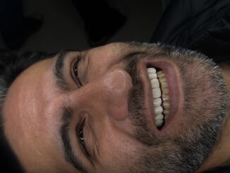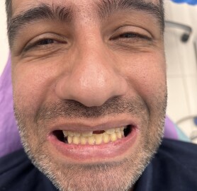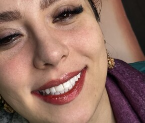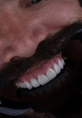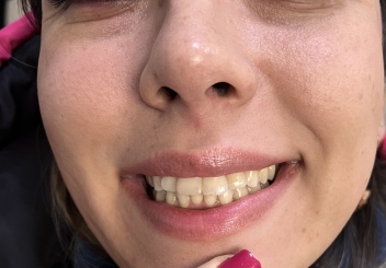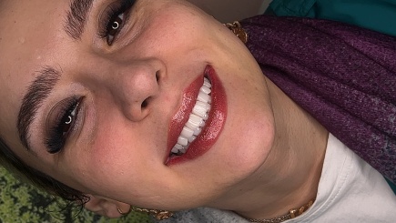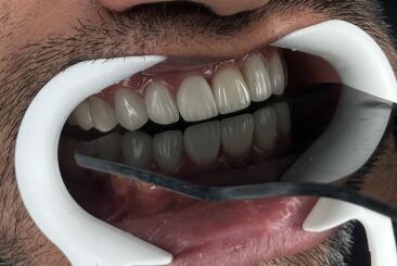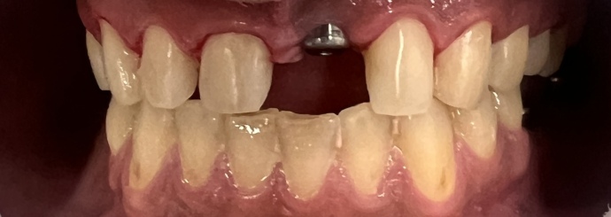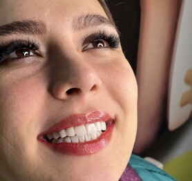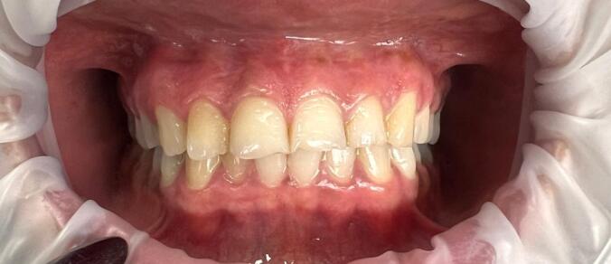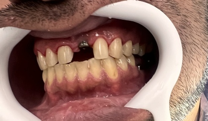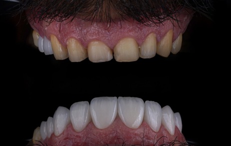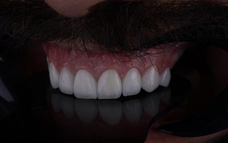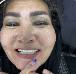 انجام جراحی ایمپلنت و درمان ترکیبی روکش های ایمپلنت دندانها در خط خنده و لامینیت های ۸ دندان در فک بالا به رنگ A1